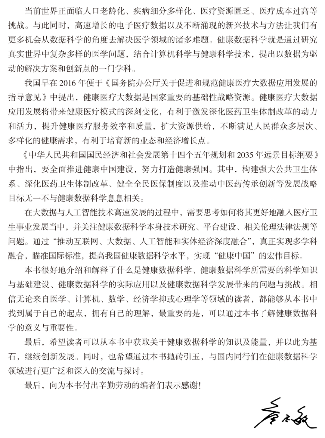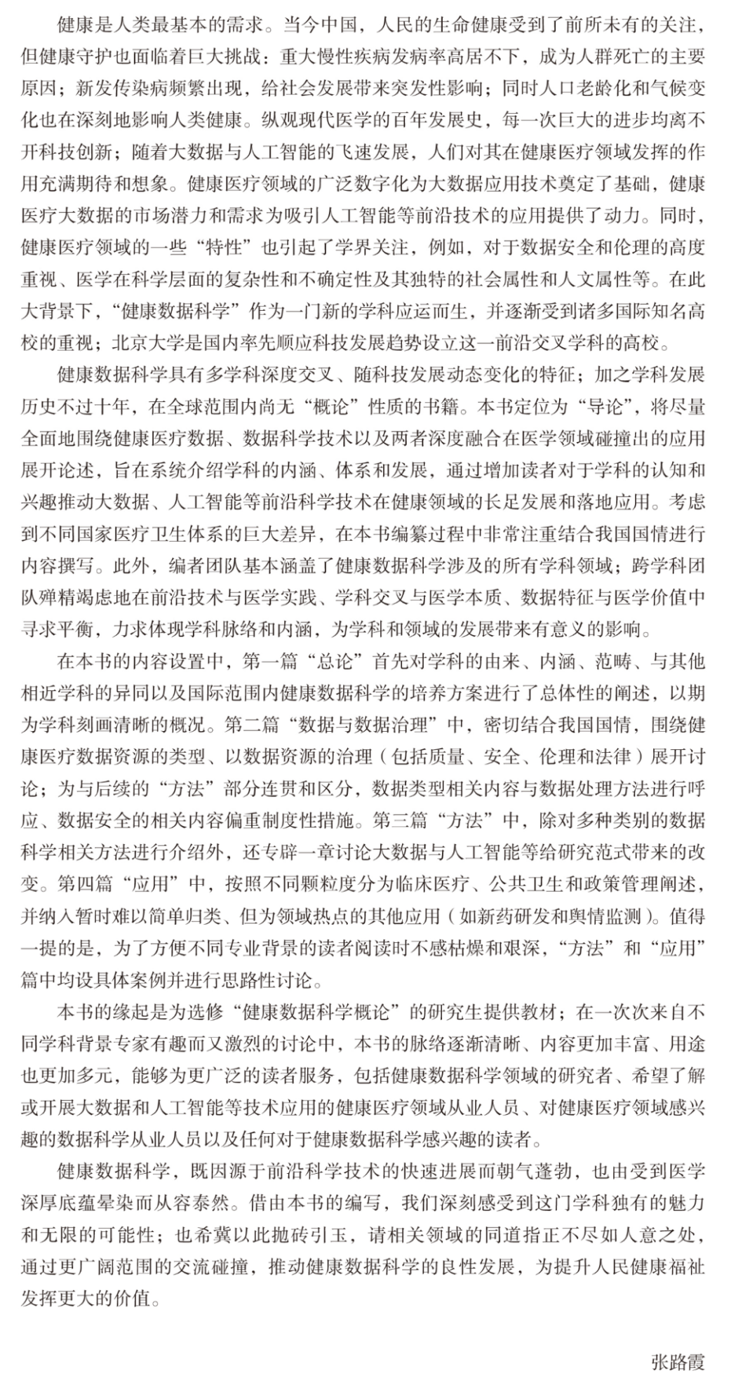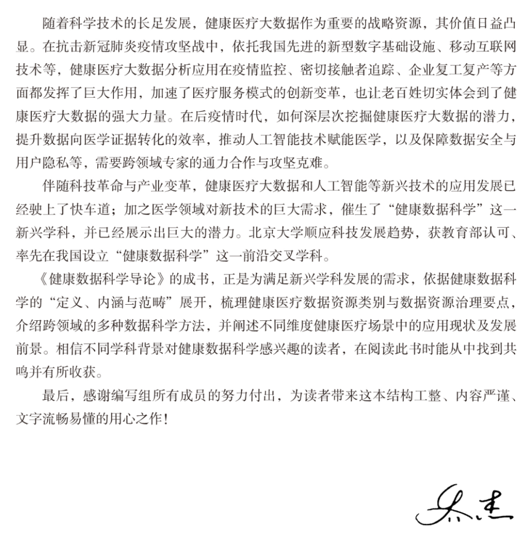 此外,编者团队基本涵盖了健康数据科学涉及的所有学科领域。跨学科团队在前沿技术与医学实践、学科交叉与医学本质、数据特征与医学价值中寻求平衡,力求体现学科脉络和内涵,为学科和领域的发展带来有意义的影响。