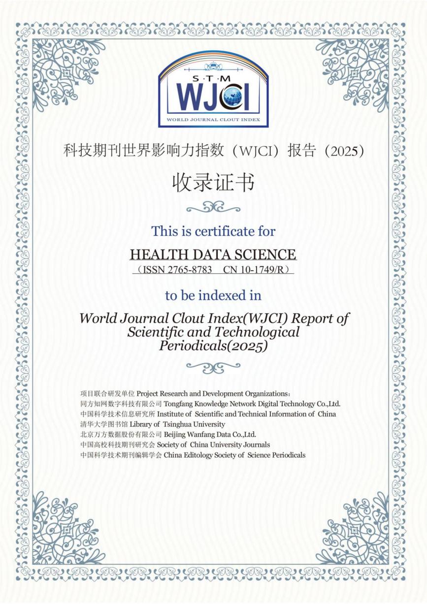 近日,由中国科学技术信息研究所、《中国学术期刊(光盘版)》电子杂志社有限公司、清华大学图书馆、万方数据有限公司、中国高校科技期刊研究会、中国科学技术期刊编辑学会联合研制的《科技期刊世界影响力指数(WJCI)报告(2025 版)》正式发布,Health Data Science凭借持续攀升的学术实力与行业影响力,连续第三年成功入选!