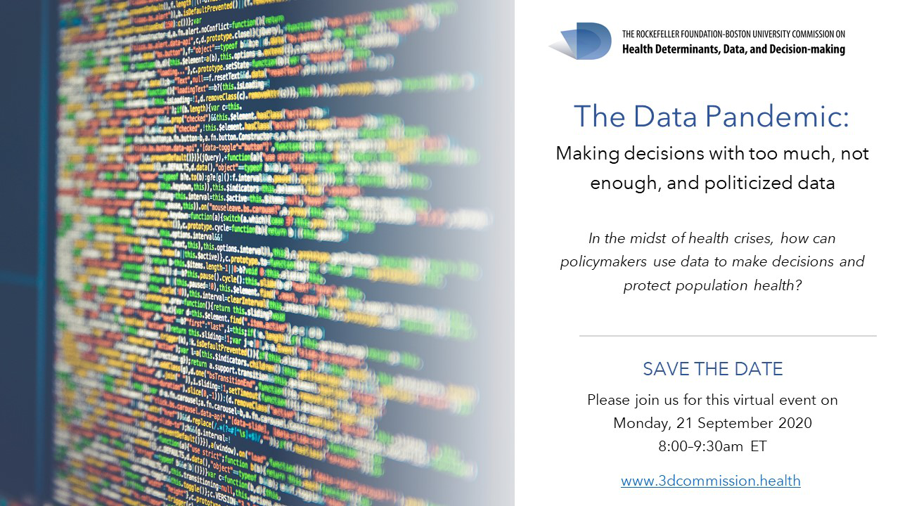 在第75届联合国大会之际,洛克菲勒基金会-波士顿大学健康决定因素,数据和决策委员会(3-D委员会)希望与大家讨论以下问题:决策者面对质量较差、不足或过量的数据,如何做出有利于大众福祉的决定?在以数据为依据的流行病防控决策过程中,有哪些重要的经验教训?