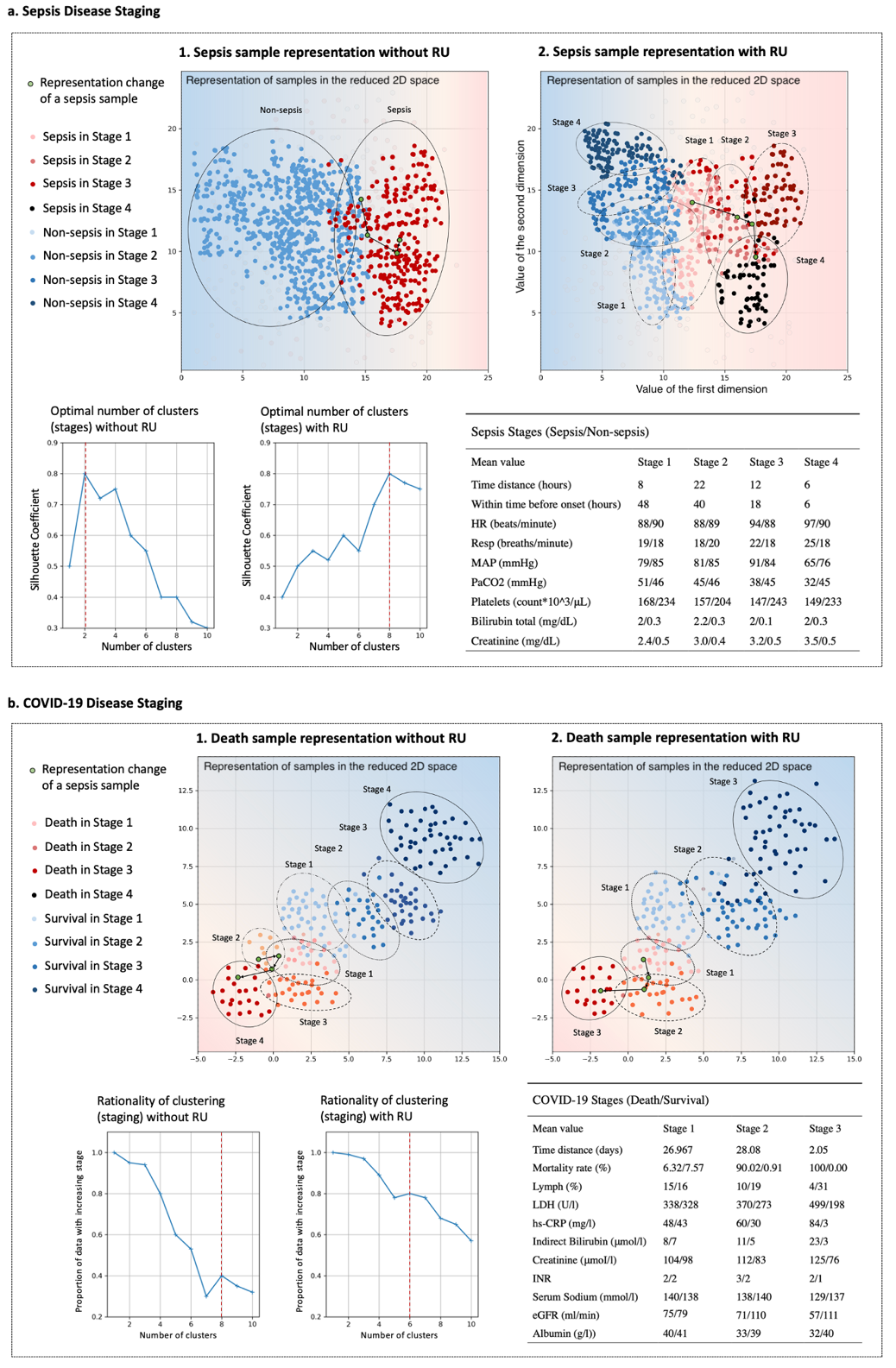 3. 对持续预后的解释可揭示疾病发展阶段和生物标志物。通过可视化模型参数的限制更新过程,发现了脓毒症的4个阶段和生物标志物(心率、呼吸、动脉压、PaCO2、血小板计数、总胆红素、肌酐)、新冠肺炎的3个阶段和生物标志物(淋巴细胞、乳酸脱氢酶、超敏C反应蛋白、间接胆红素、肌酐)。不同的疾病发展阶段具有不同的死亡风险和标志物水平、体现出某些疾病特性,如特定的生命体征变化可反映急性脓毒症的发生,具有某些先天特征更易患脓毒症等。