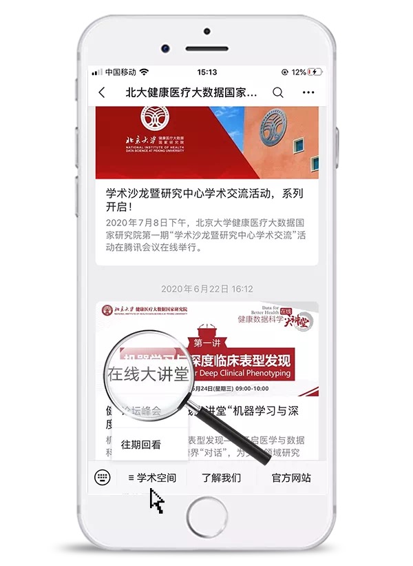 3.关注“北京大学健康医疗大数据国家研究院”公众号,点击如下菜单注册,锁定在线大讲堂直播课程!